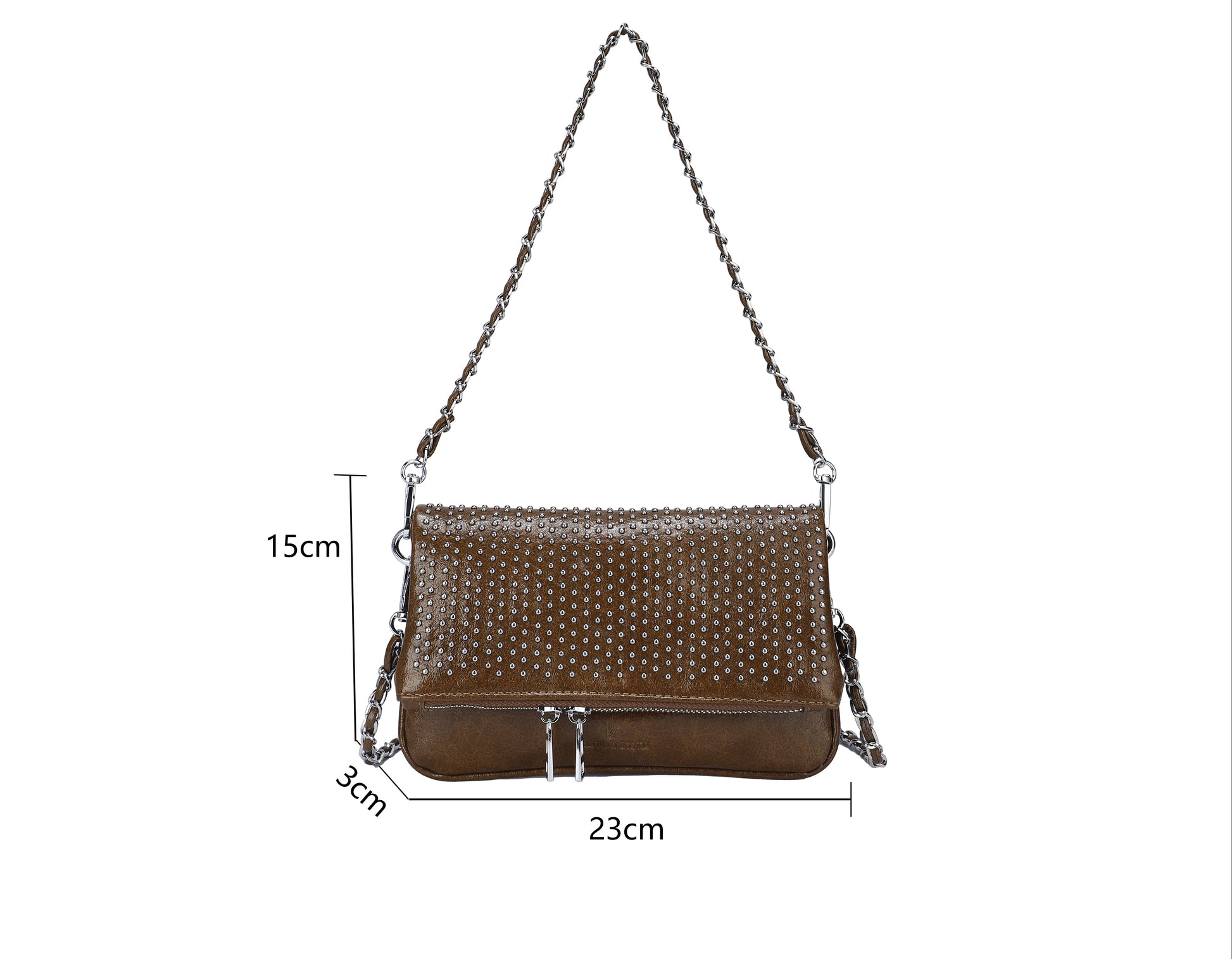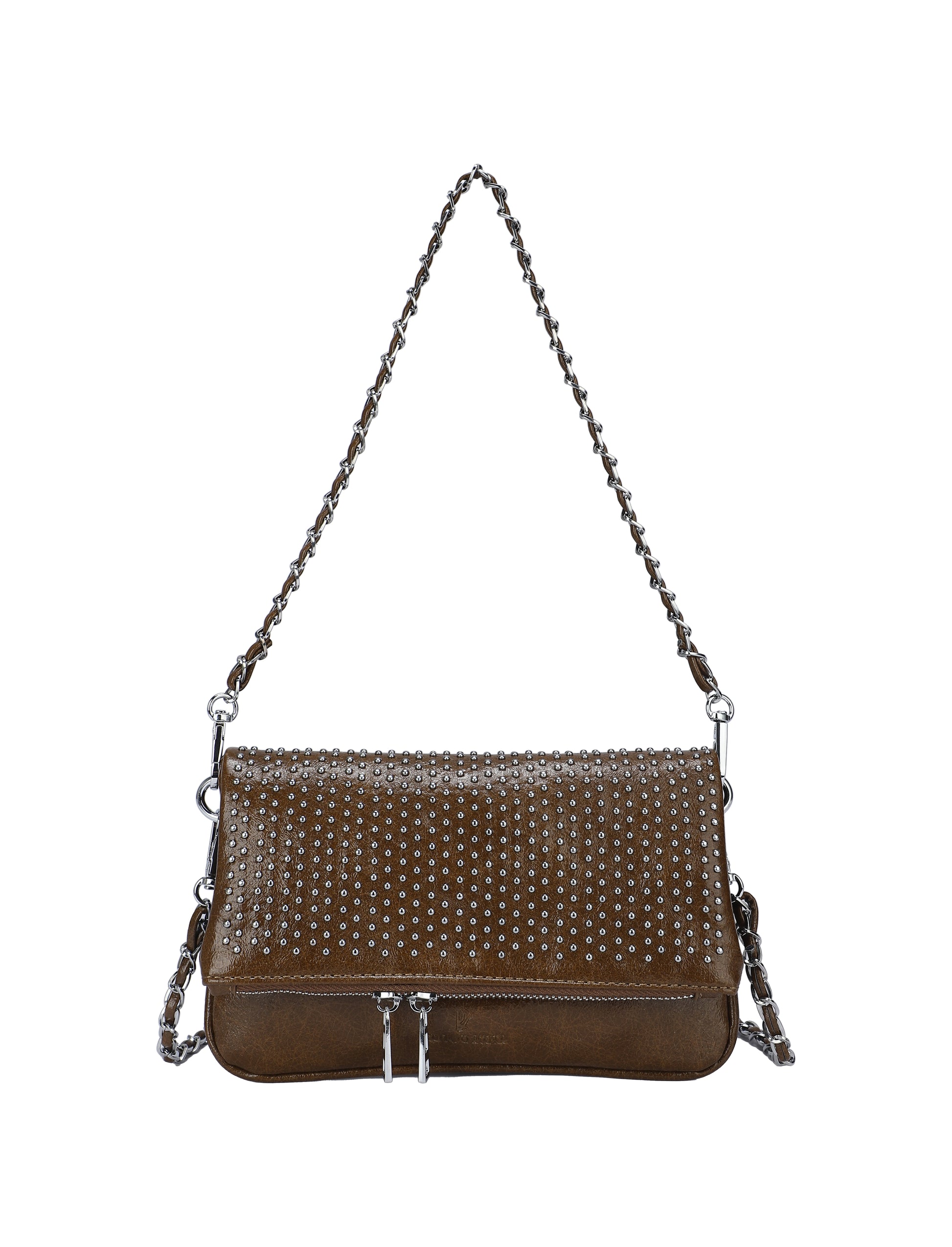 Bolso de mano y bandolera con tachuelas plateadas y solapa con cremallera en color marrón chocolate - mbyou