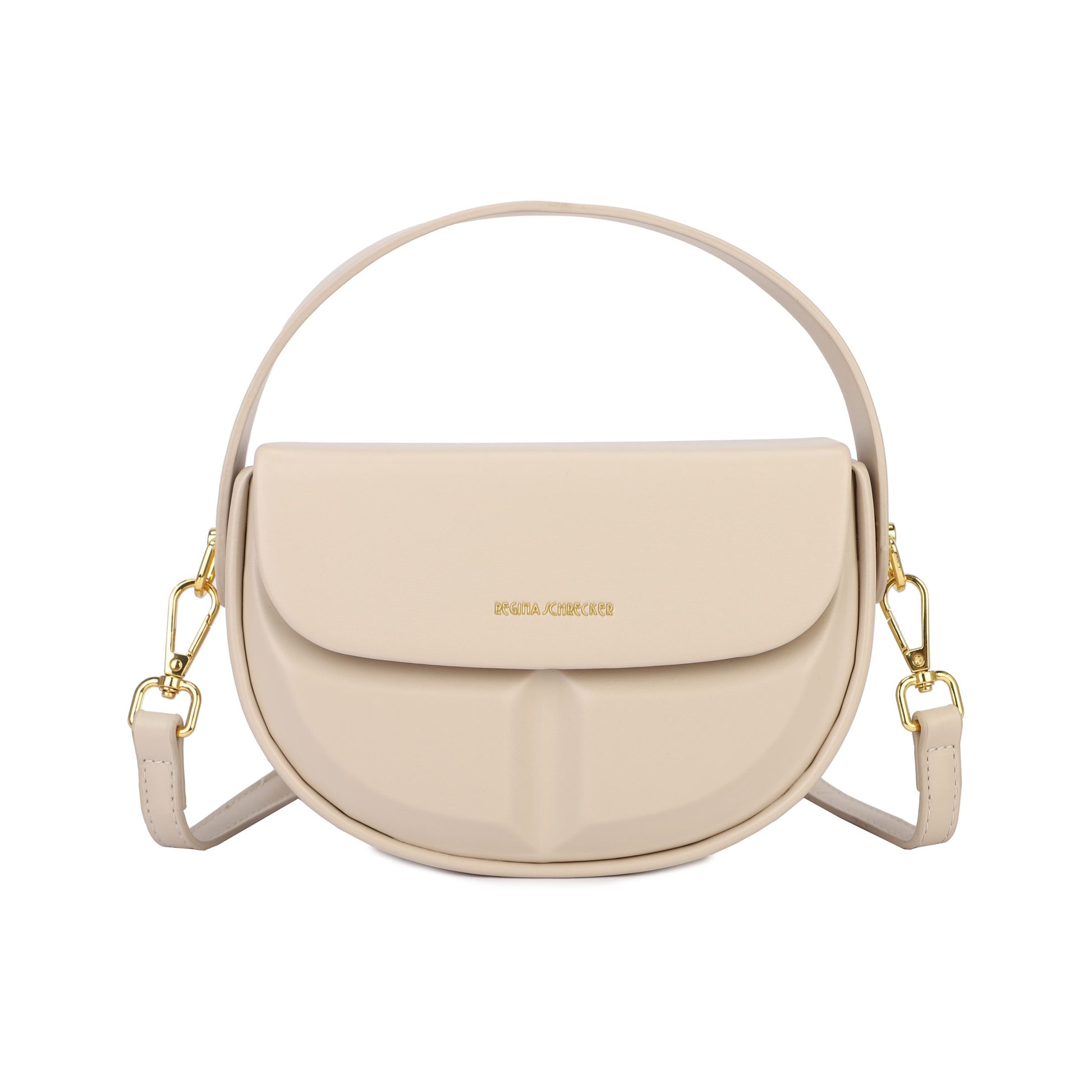 Bolso de mano y bandolera rígido con forma media luna y detalles geométricos color beige - mbyou