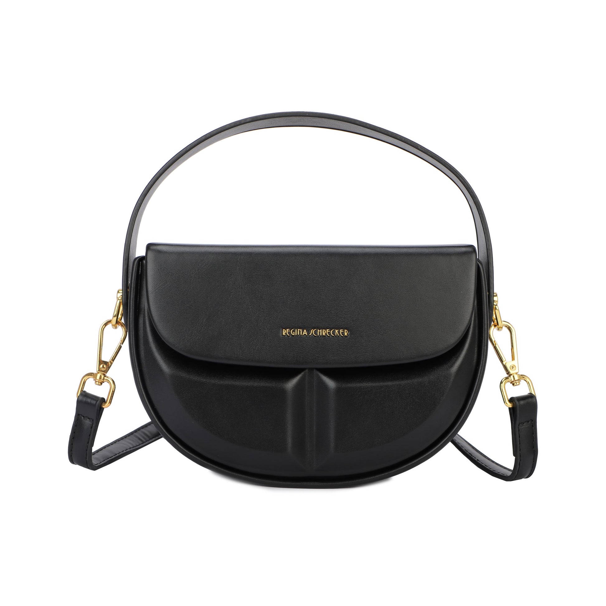 Bolso de mano y bandolera rígido con forma media luna y detalles geométricos color negro - mbyou