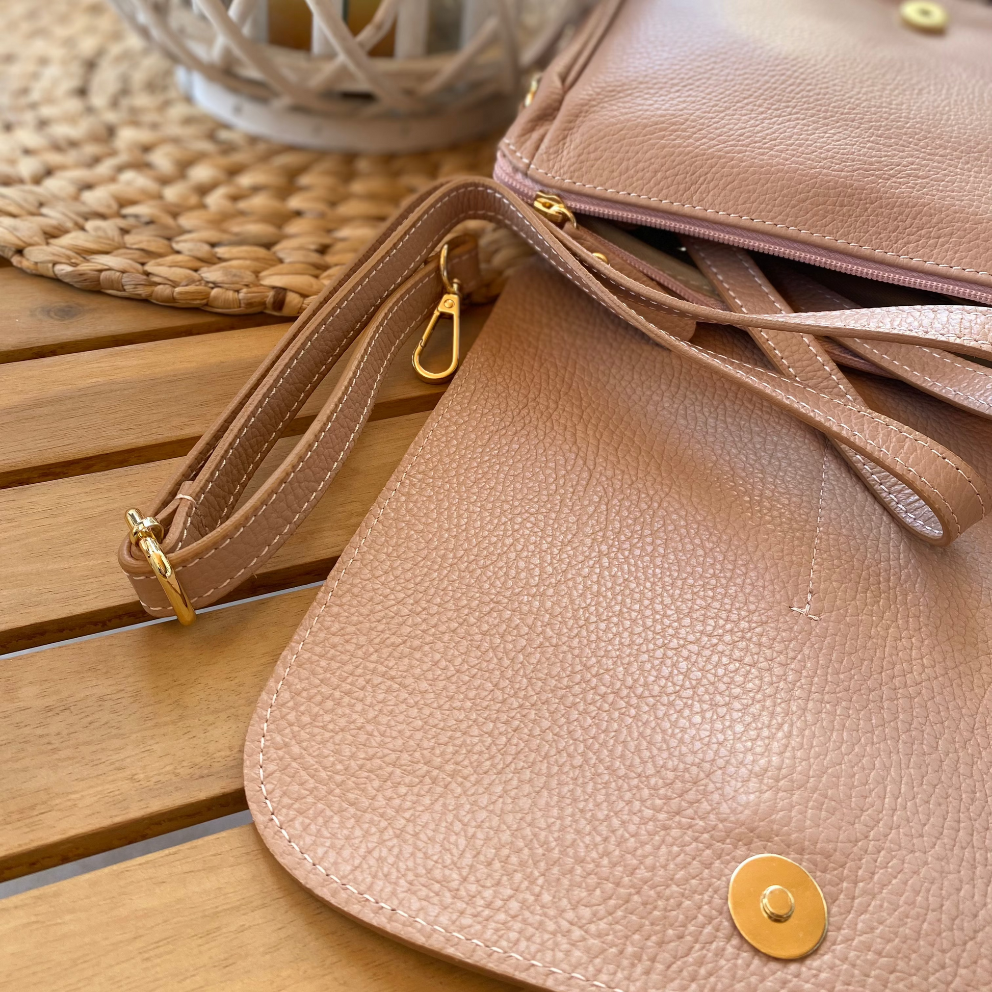 Bolso de piel 100% auténtica bandolera con solapa y tira de piel con detalle dorado color rosa nude