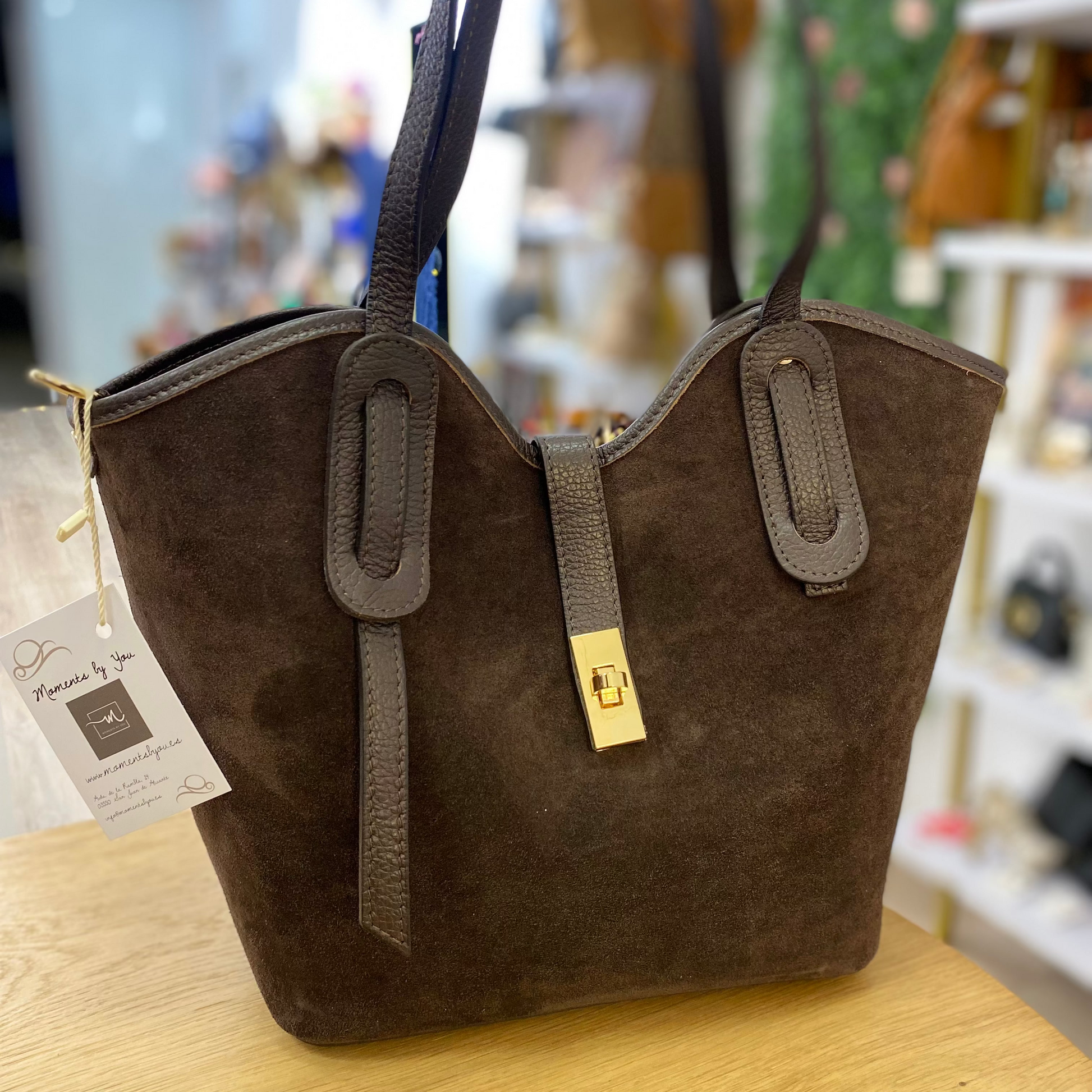 Bolso shopper de piel 100% vacuno acabado ante con neceser interior color marrón chocolate - mbyou