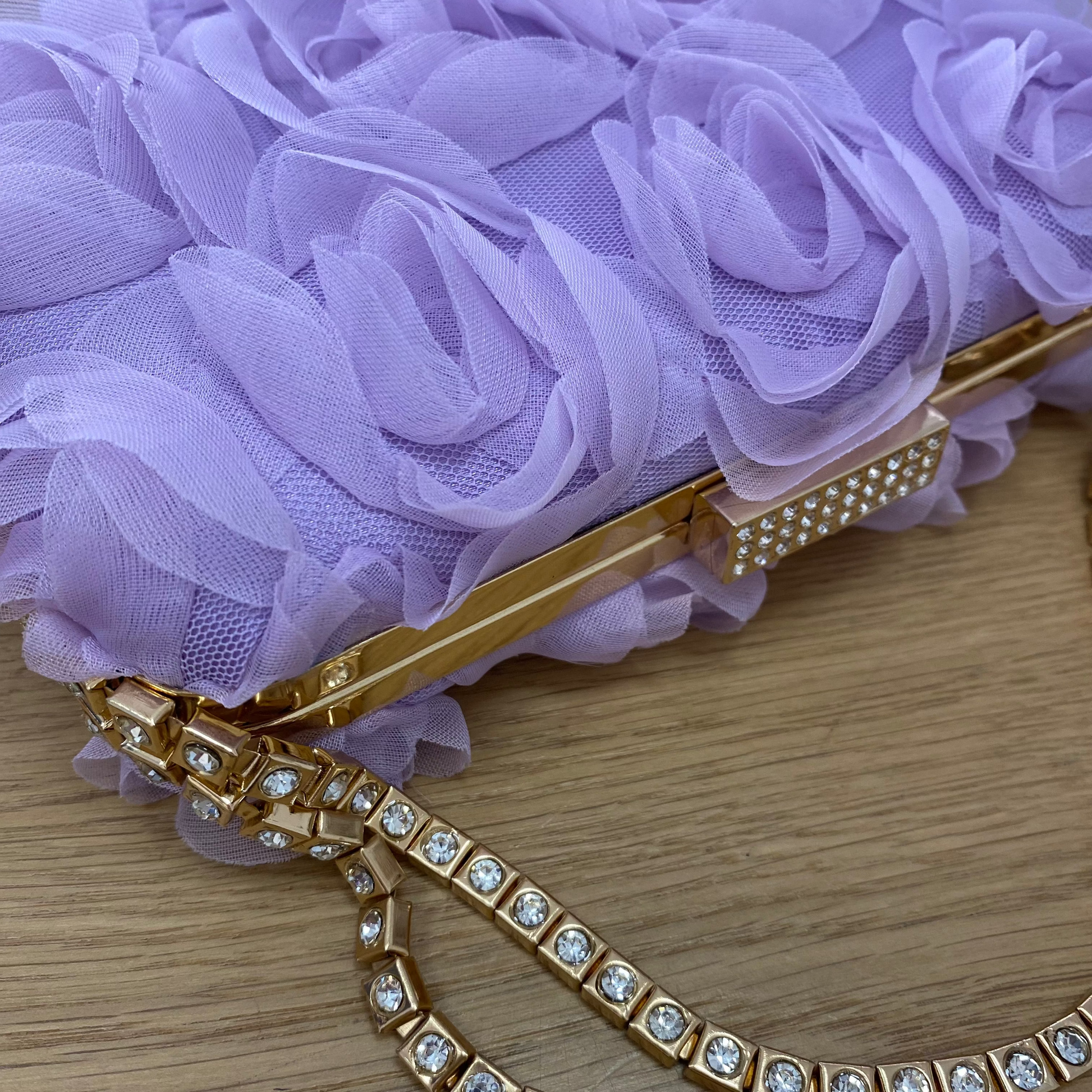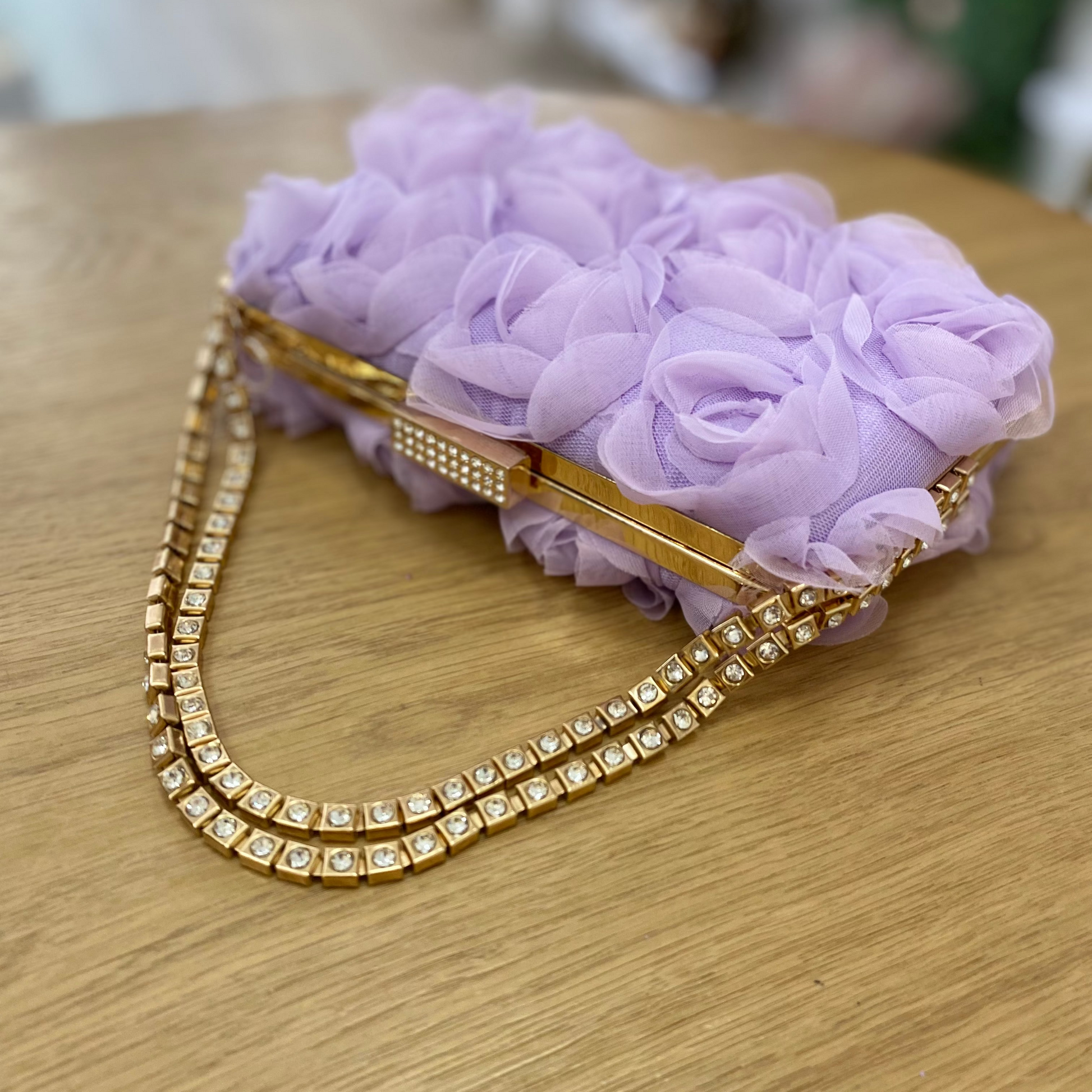 Bolso de mano de fiesta con flores de tela y cadena con circonitas color malva claro - mbyou