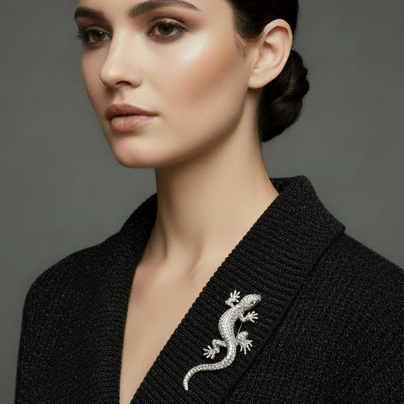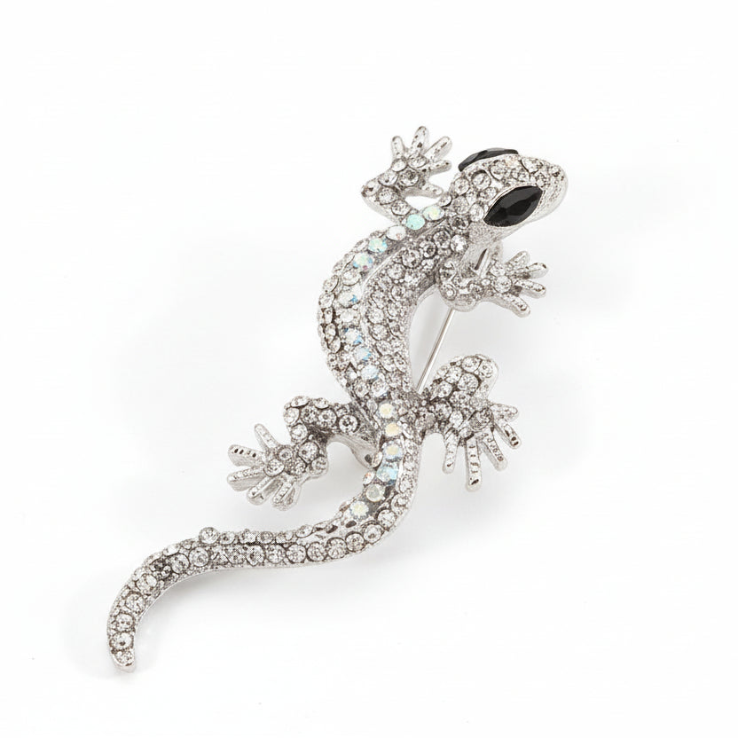 - Broche en forma de lagartija con circonitas por todo el cuerpo en color blanco y dos de ellas en los ojos en color negro.