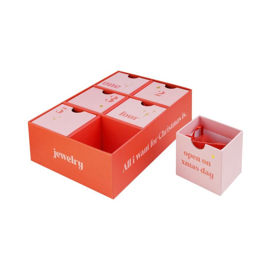 Contiene joyas y accesorios de acero inoxidable dorado. Cada calendario de adviento consta de 6 compartimentos con diferentes elementos.