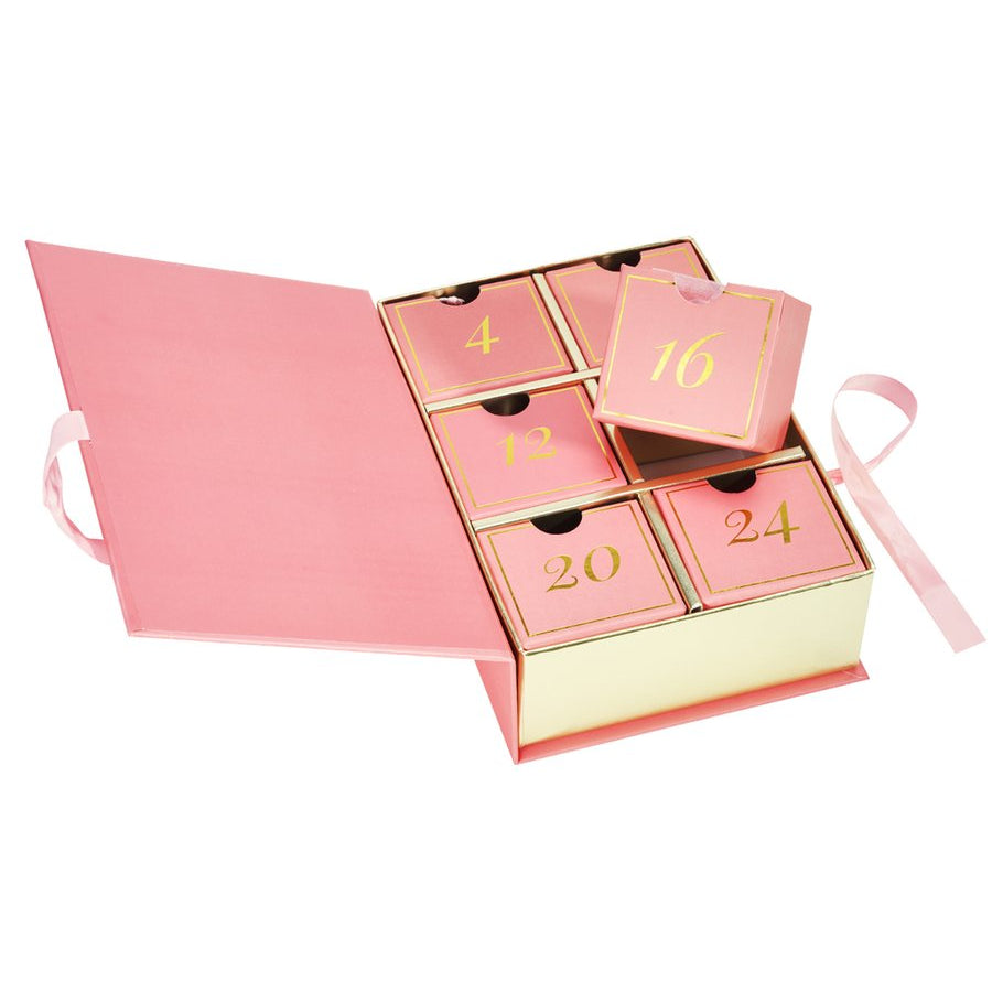 Contiene joyas y accesorios de acero inoxidable dorado. Cada calendario de adviento consta de 6 compartimentos con diferentes elementos.