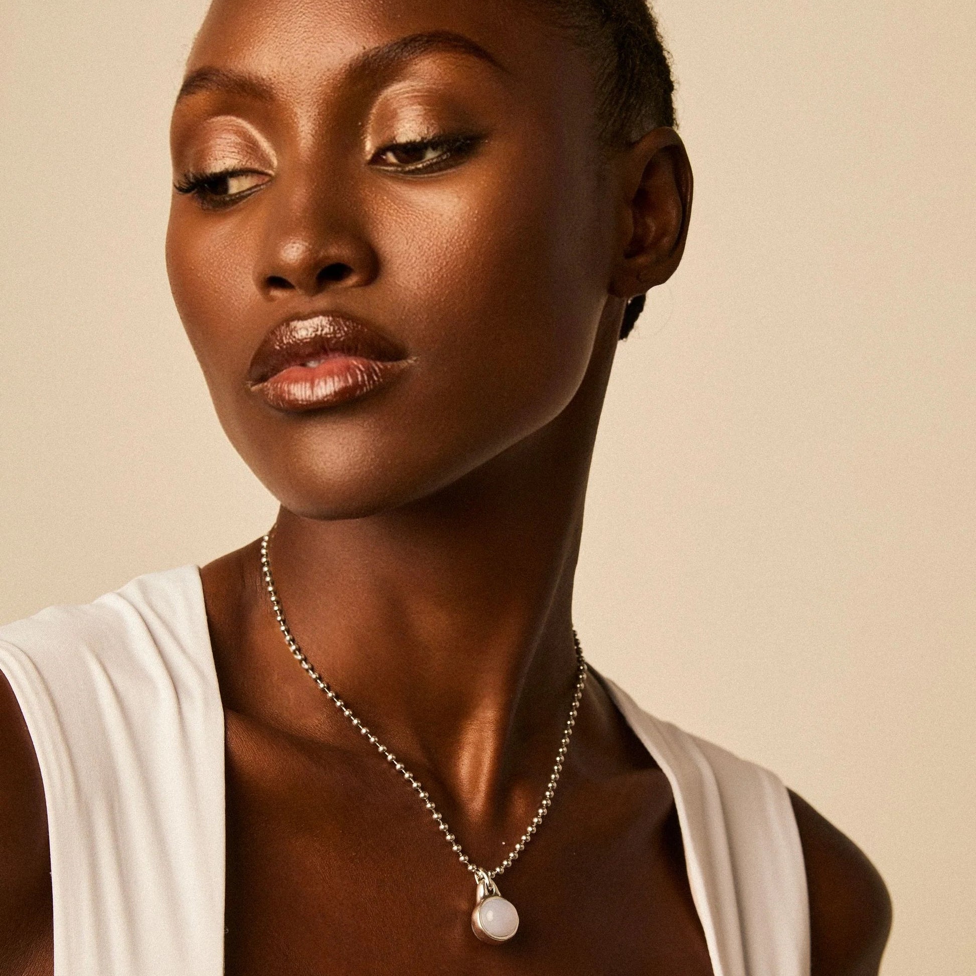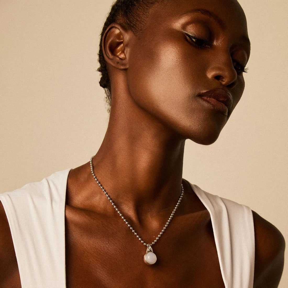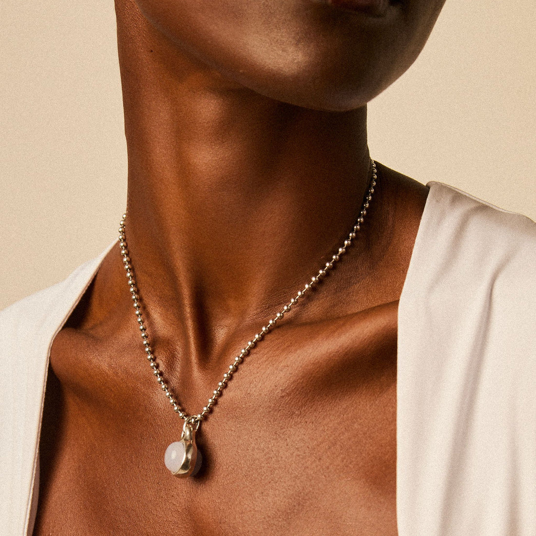 Collar de cadena de bolas con un colgante metálico redondo con una piedra semipreciosa redonda en cada lado.