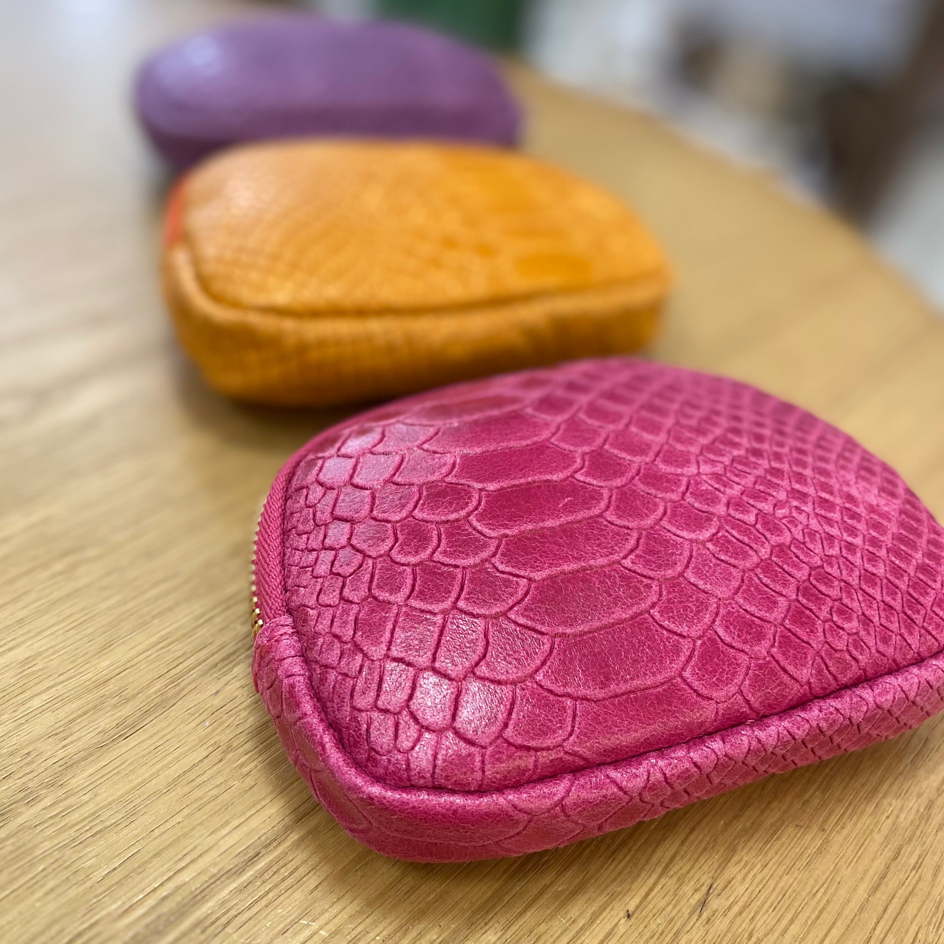 Monedero piel 100% vacuno con estampado y relieve de serpiente. Tamaño mediano. Interior forrado de tela beige. Detalles en dorado brillante.