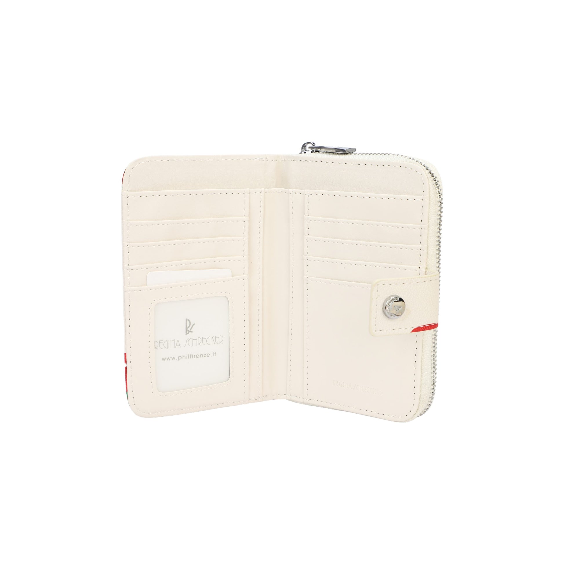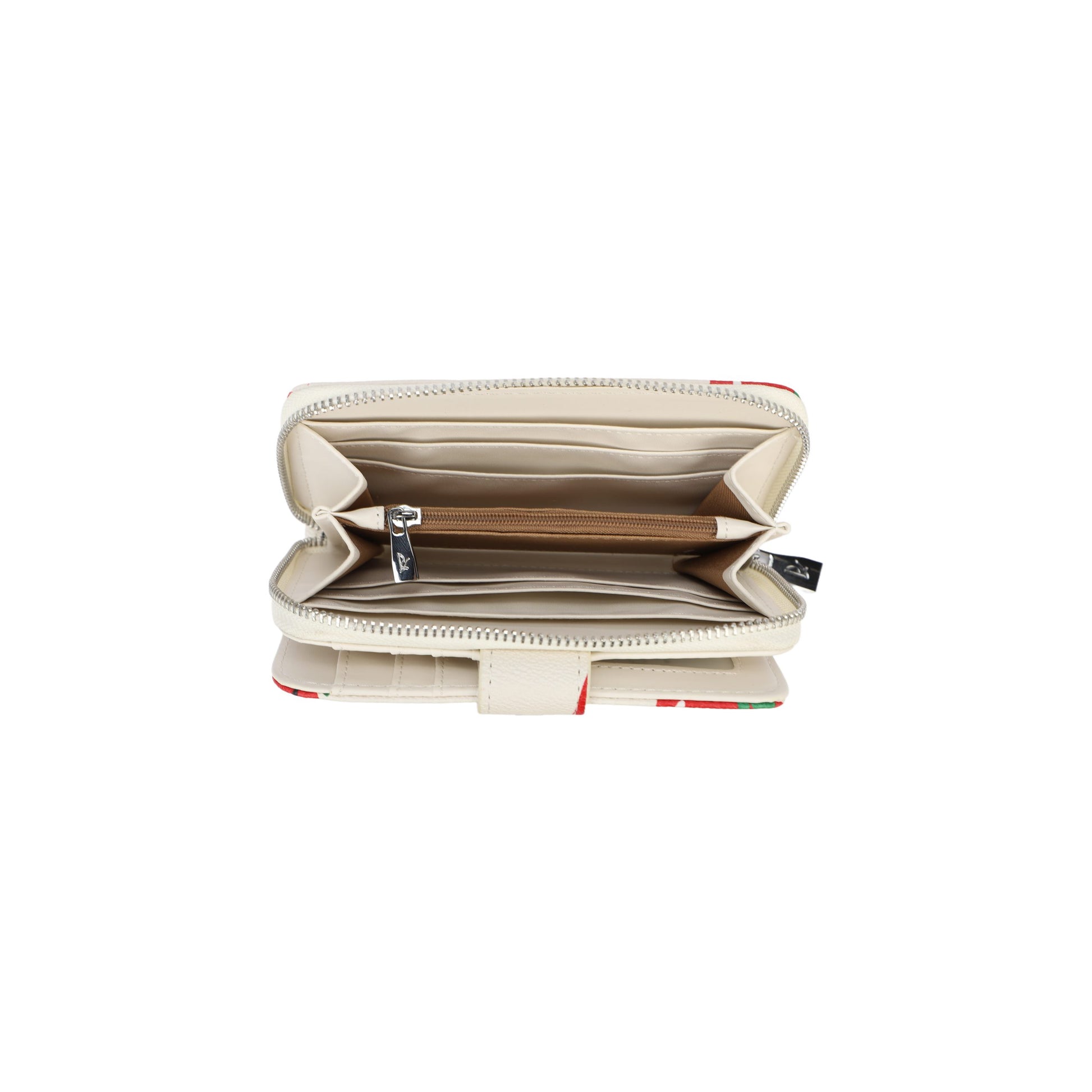 Monedero, tarjetera y billetera en color perla con un estampado de fresas y de piel sintética en formato botón de click y cremallera. Dentro del compartimento del botón se encuentra la zona del trajetero y las billetera y fuera de esta se encuentra el compartimento de la cremallera que dentro esta la zona del monedero y más apartados para tarjetas .