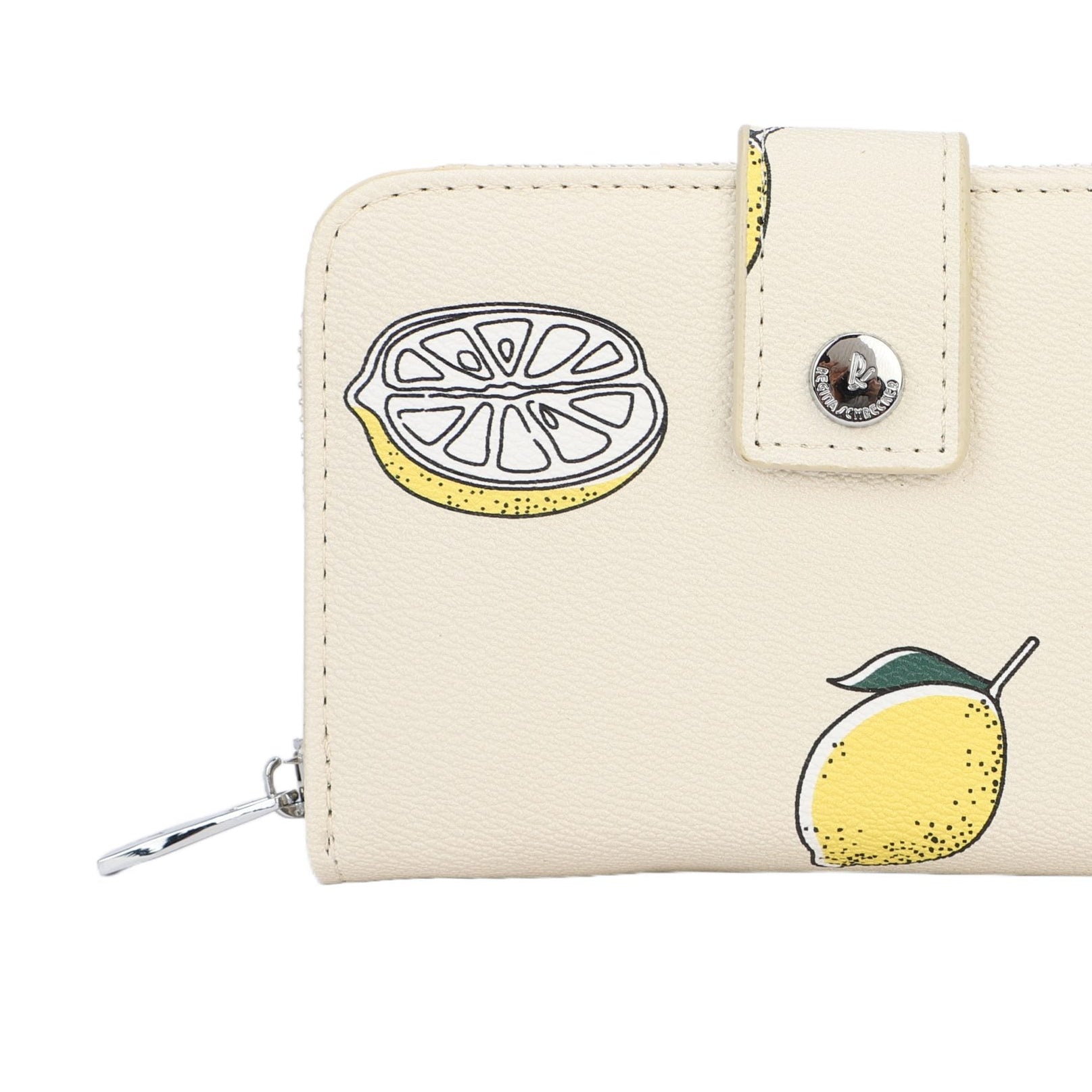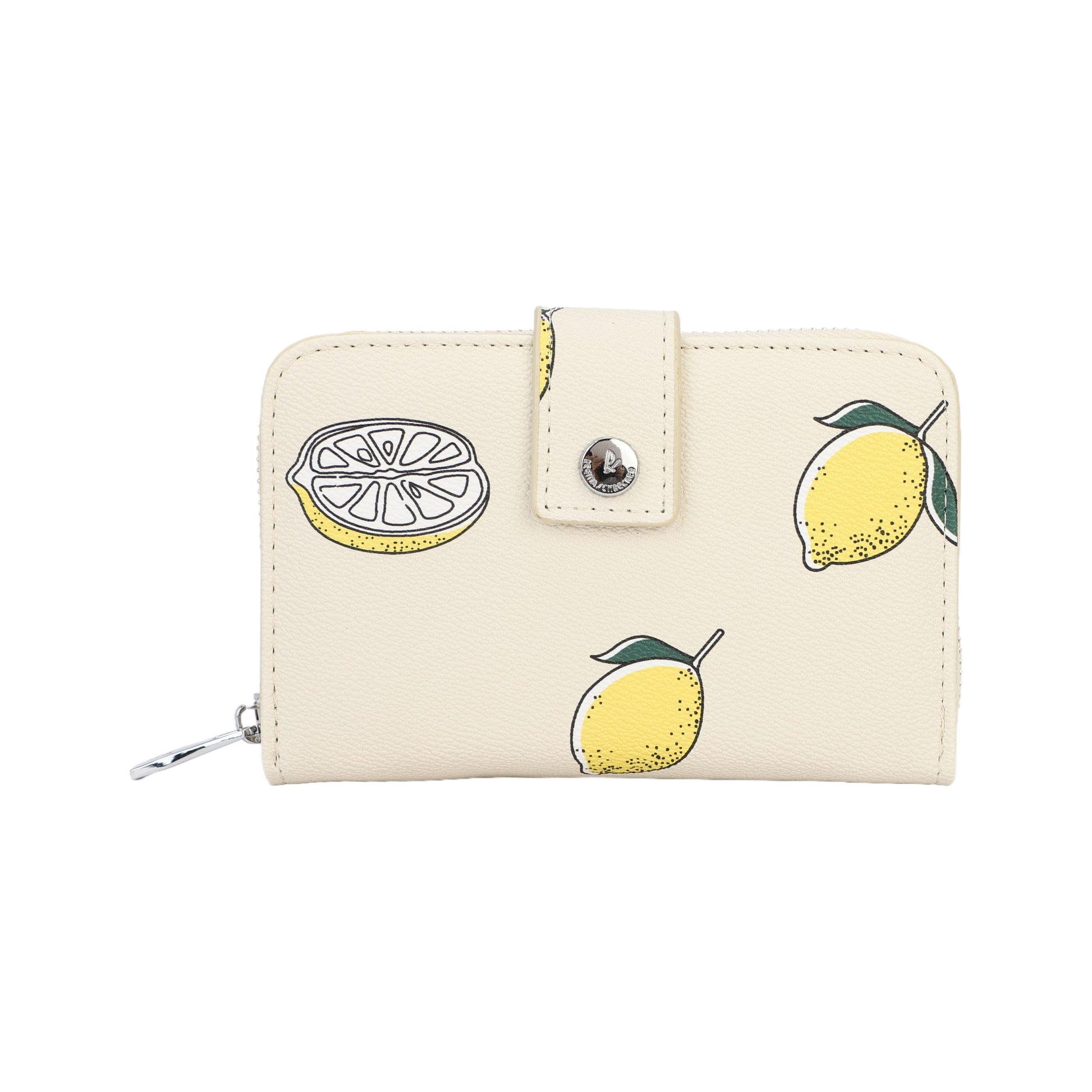 Monedero tamaño mediano con botón de click y cremallera efecto piel en color beige con estampado de limones - mbyou