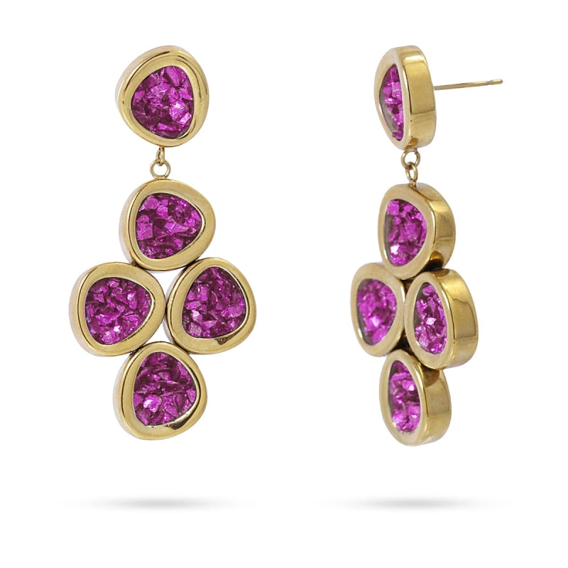 Pendientes largos de acero quirúrgico con conjunto de drusas en fucsia acabado oro - mbyou