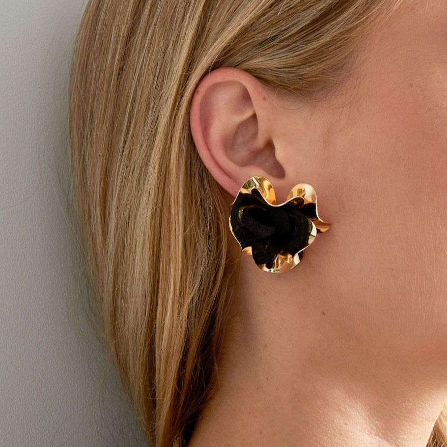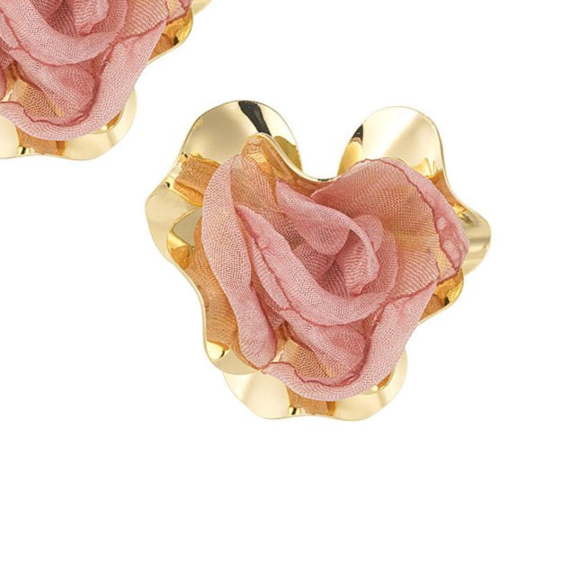 - Pendientes metalizados en forma de flor con tela rosa en el centro de esta y con metal en acabado oro por fuera.