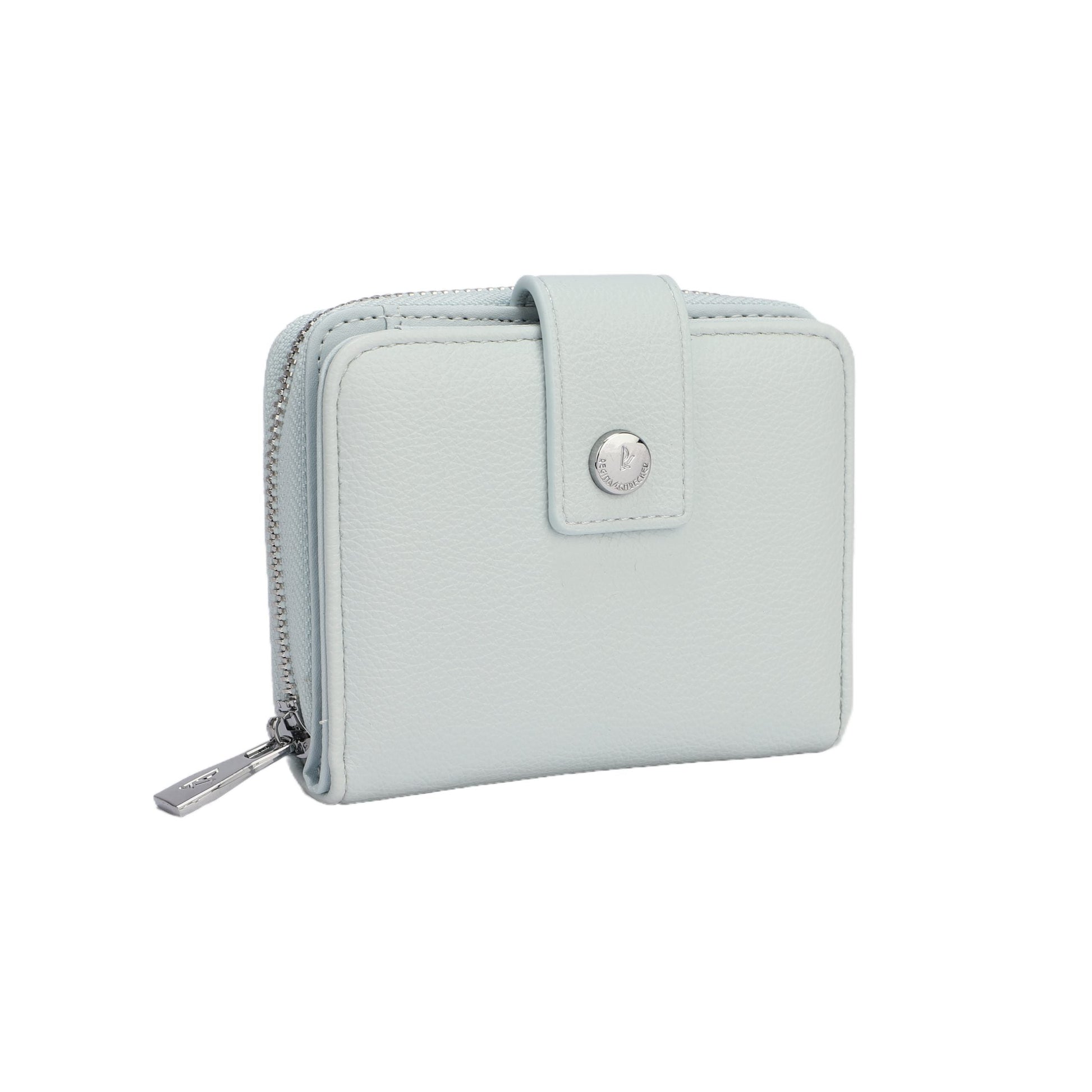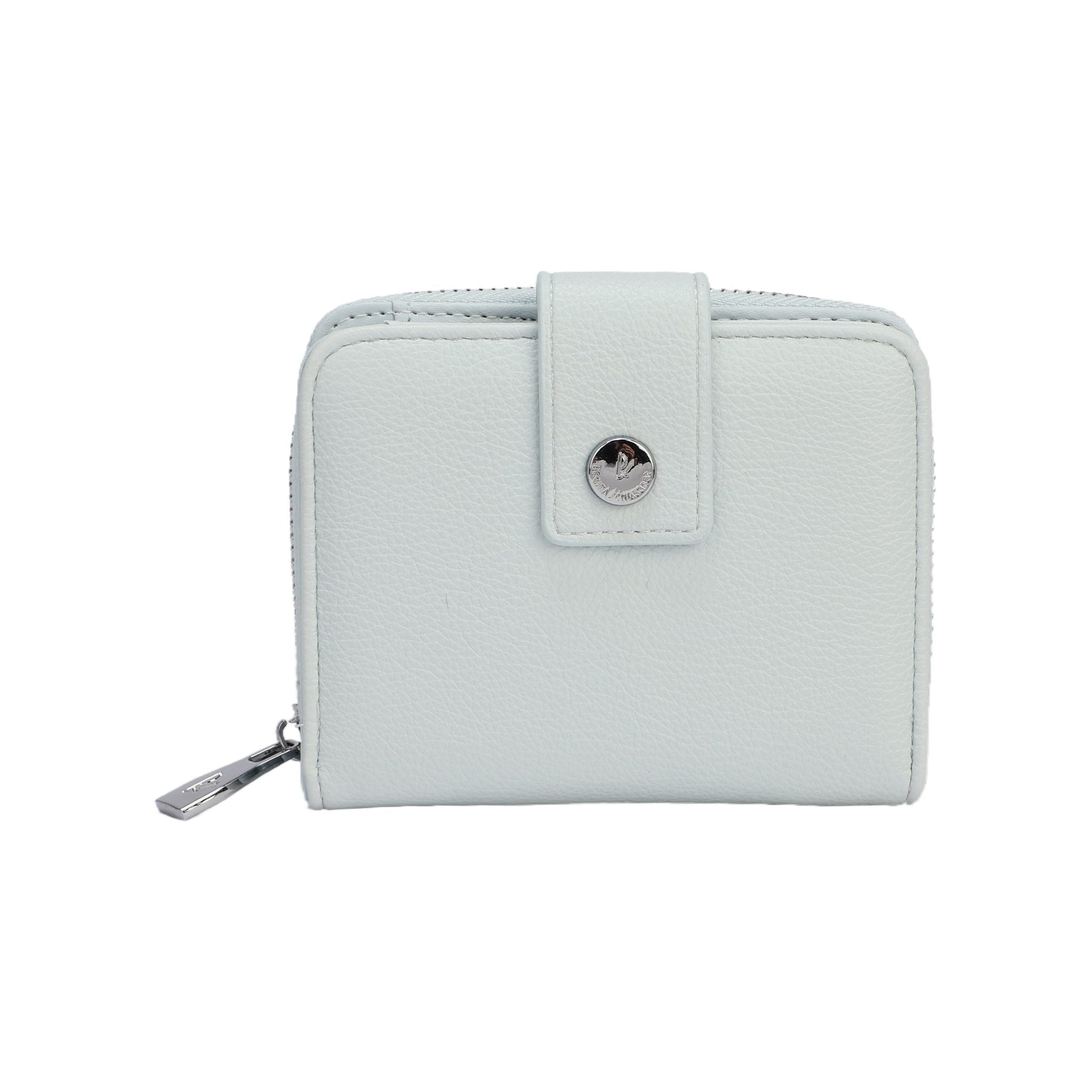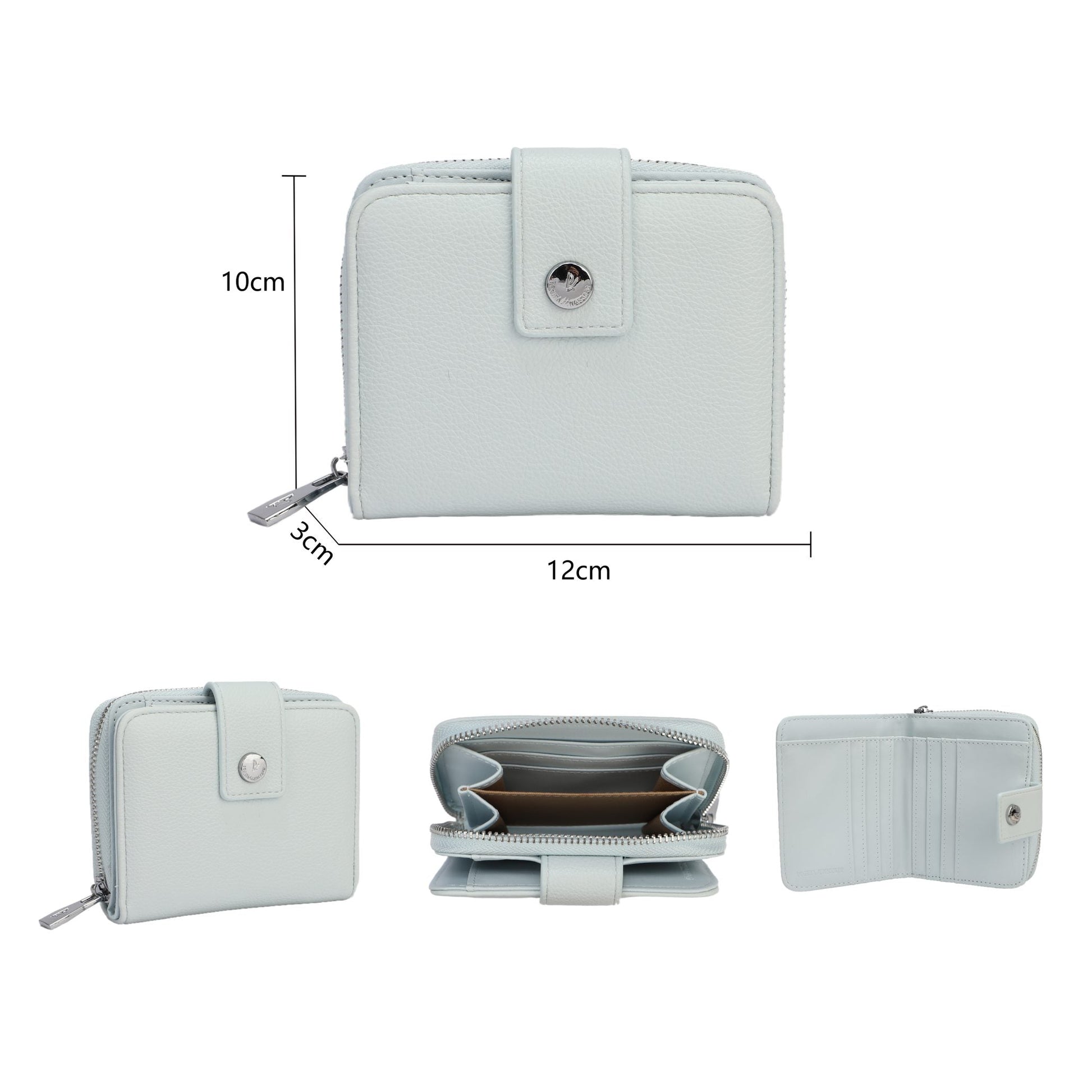 Monederos lisos, sin estampados de varios colores en tonos pastel. Interior para tarjetas y billetes. Además cuenta con monedero con varios departamentos. Cierre con cremallera y botón. Acabados plata.